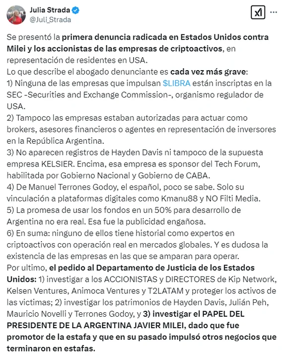 La diputada de Unión por la Patria, Julia Strada, comentó en redes sociales que esta es “la primera denuncia radicada en Estados Unidos contra Milei y los accionistas de empresas de criptoactivos, en representación de residentes en USA”, y calificó la situación de cada vez más grave.