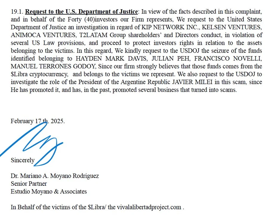 Dentro de los involucrados se menciona a Hayden Davis, identificado como asesor en el lanzamiento de la criptomoneda, aunque, según la denuncia, no existen registros oficiales que respalden su rol. Asimismo, se solicita investigar a los accionistas y directores de Kip Network, Kelsen Ventures, Animoca Ventures y T2LATAM, y se pide la protección de los activos de los afectados.